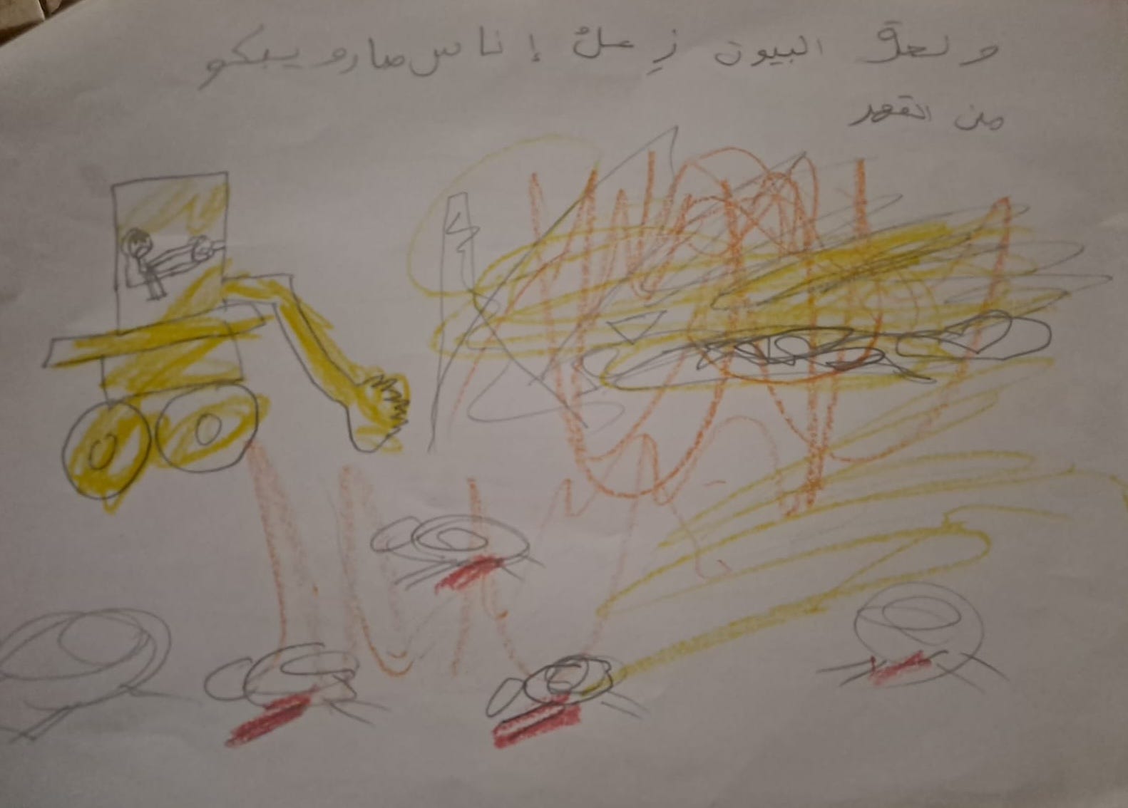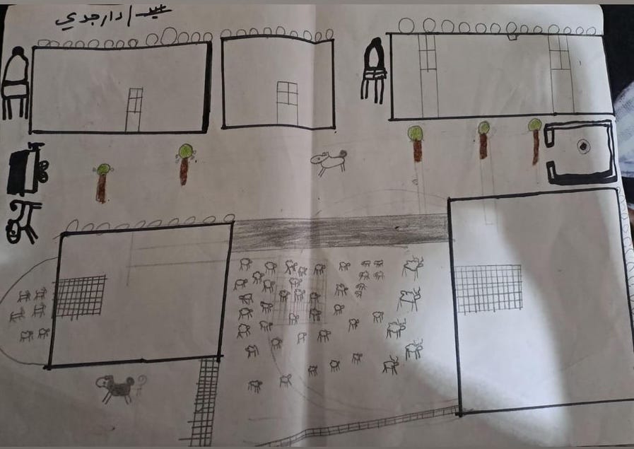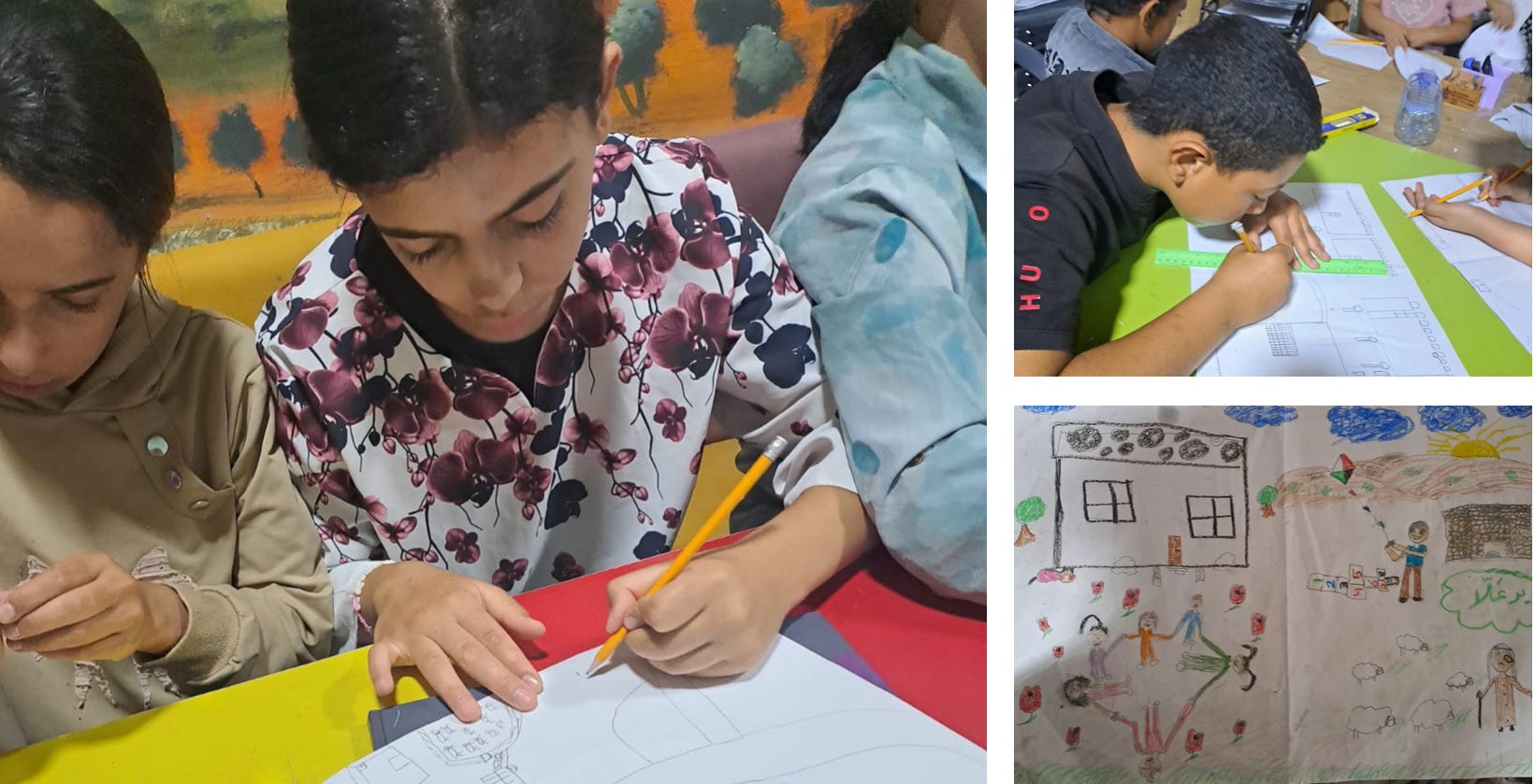 We have some drawings made by children that reflect their experiences—some have drawn demolished homes, military vehicles, or crying figures, while others expressed hope by drawing olive trees and doves. I’d be happy to share a selection of these with you.