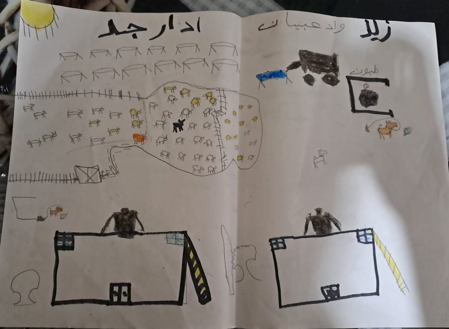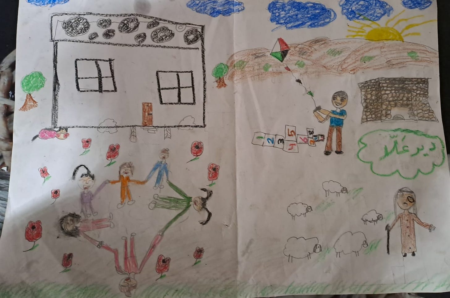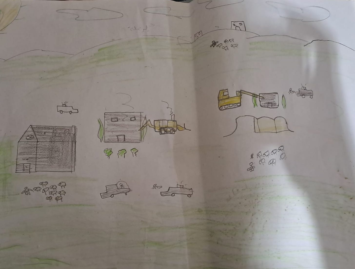 We have some drawings made by children that reflect their experiences—some have drawn demolished homes, military vehicles, or crying figures, while others expressed hope by drawing olive trees and doves. I’d be happy to share a selection of these with you.
