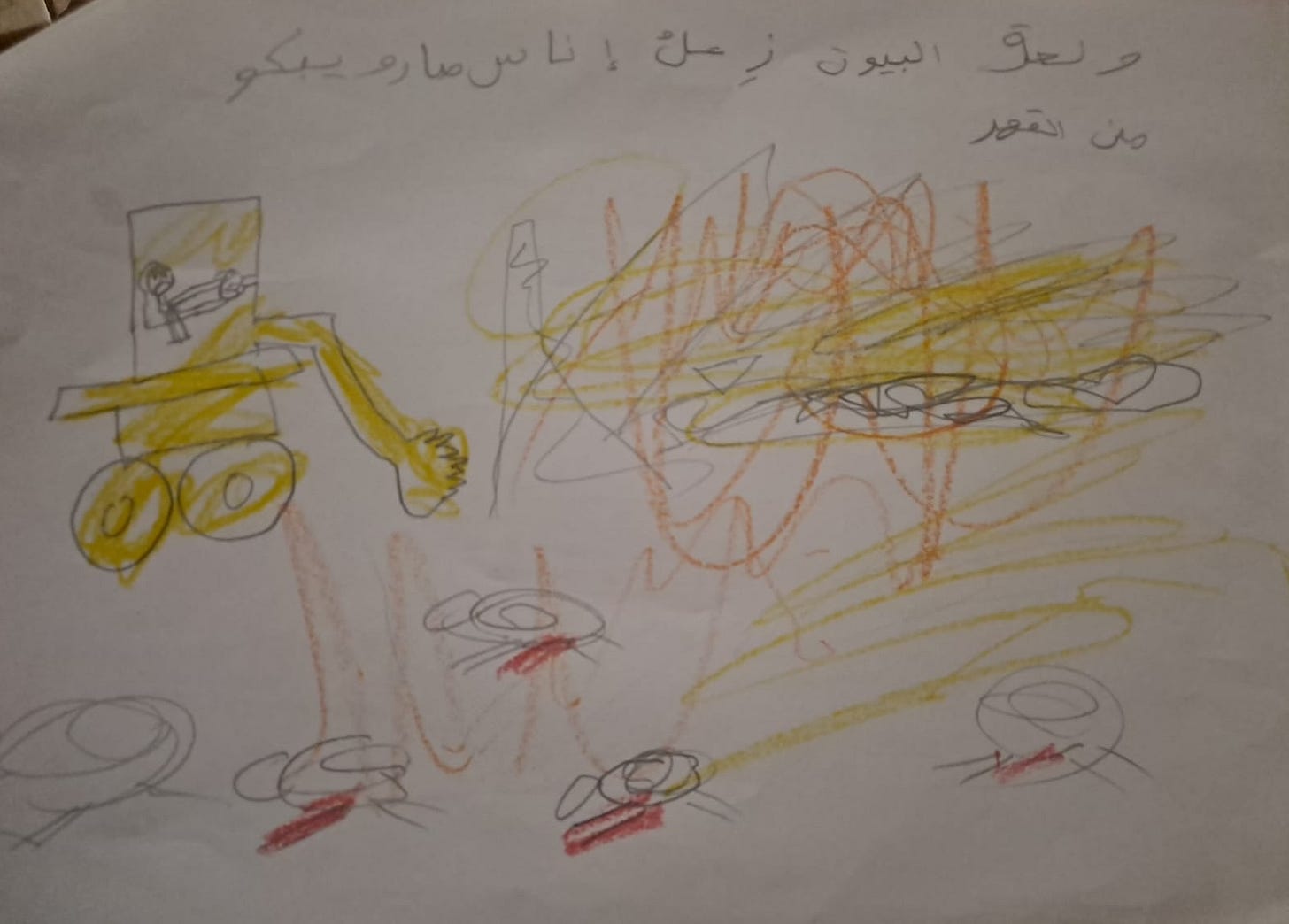 This drawing also features a yellow backhoe and demolished home. Blood flows from animals killed by settlers. The Arabic says, “The houses were burned and people were sad. They cried because they were powerless.”