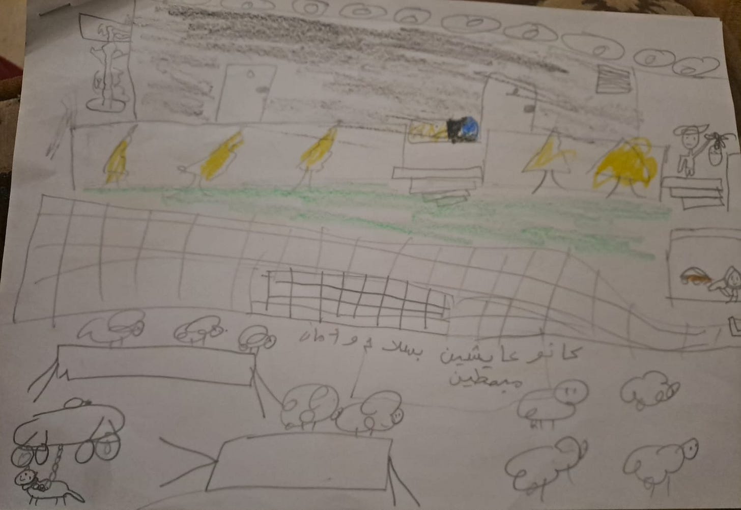 A happier scene is depicted in the drawing above. The animals, which appear to be sheep, are alive and healthy, and one animal in the lower left corner has a smile. The Arabic says, “They used to live in peace and they were happy.”