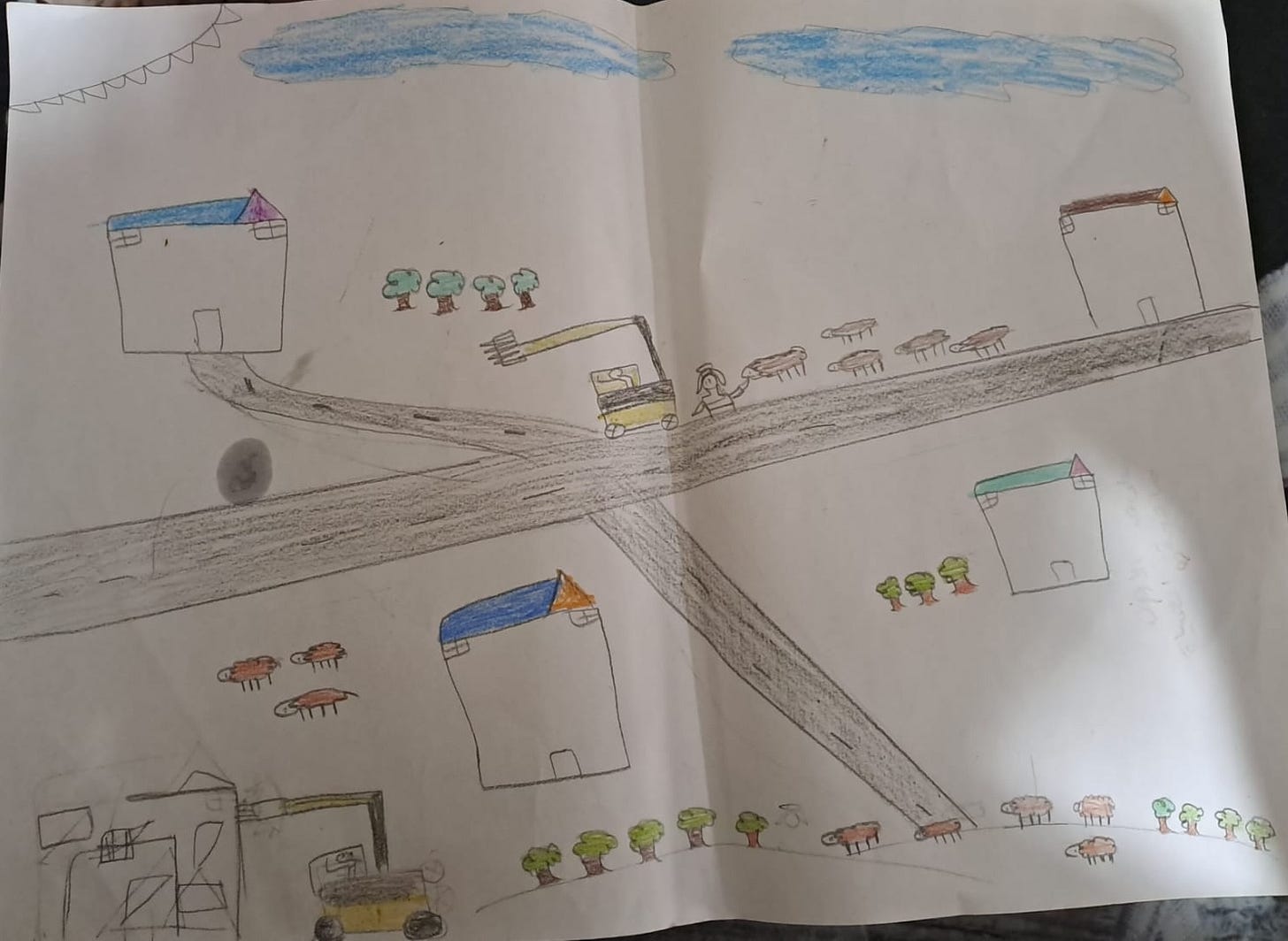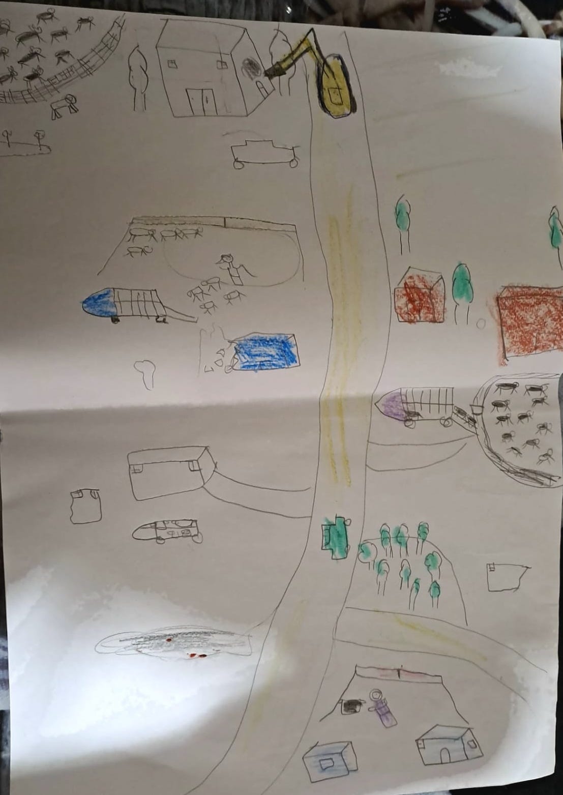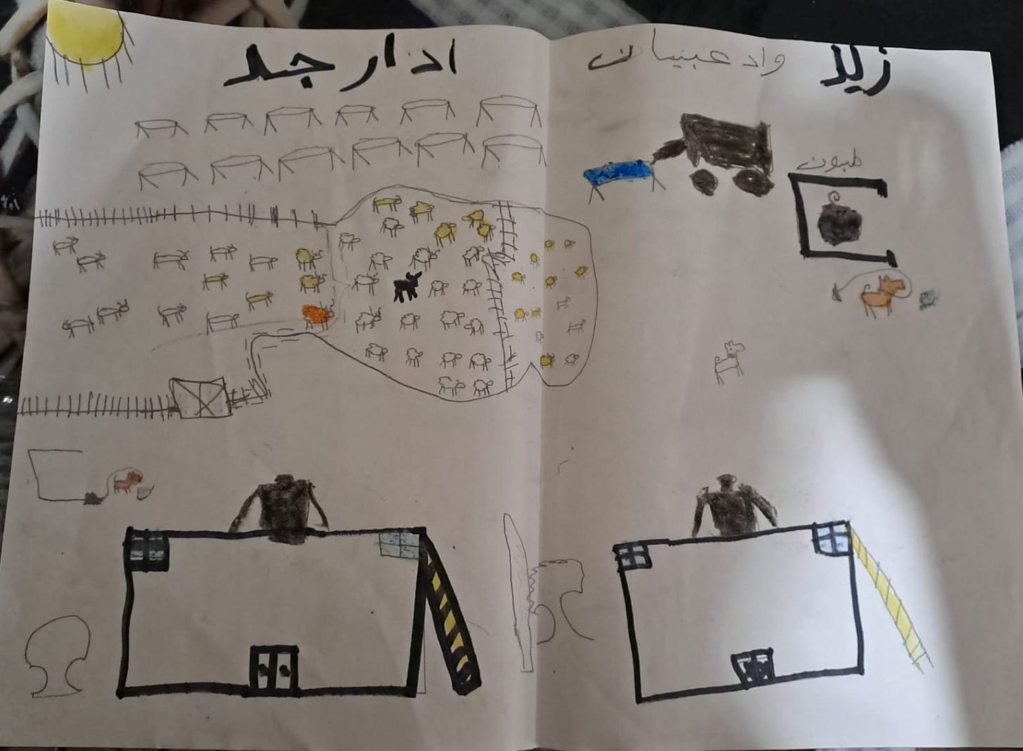 Sabah sent the following three pictures. These, also, are important “Palestinian voices.” They tell a Palestinian story, conveyed through the drawings of children, about a way of life that’s being destroyed. They convey fear, sadness, loss, violence, and also happiness and hope. The power of these drawings is retained and conveyed despite, as I must note, the poor lighting in some of the photographs.