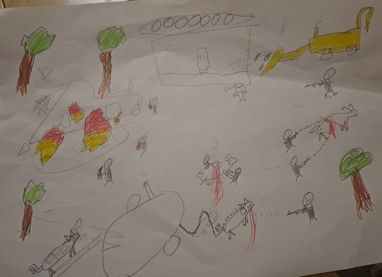 In the drawing above, a yellow backhoe is in the process of demolishing a home. This is the machinery typically used to destroy houses in the West Bank. They show up frequently in children’s drawings. Settlers are carrying assault weapons and killing animals. On the left, more settlers hold Molotov cocktails. These were thrown into a home one night as the family slept. This terrifying incident is depicted with flames of yellow and red.