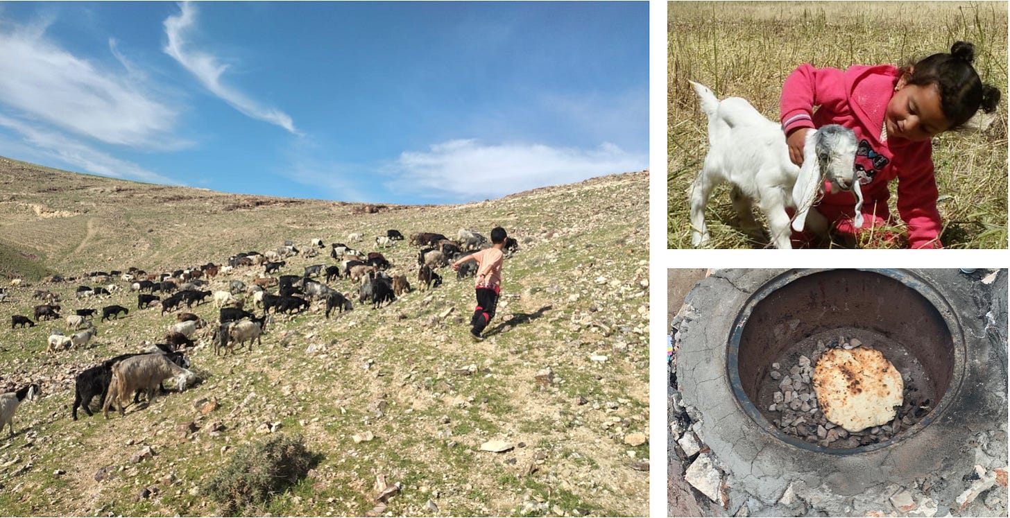 All of the families—along with their goats and sheep—had relocated to the nearby village of Kisan where they were taken in by relatives. Multiple generations and family members—brothers and their wives, children, cousins, grandparents—were living in homes meant for many fewer inhabitants. People and animals whose days and lives had been defined in part by wandering and grazing upon the land had been forced into village life, shoehorned into cramped and unsuitable living conditions. Adnan’s house in Kisan was packed to overflowing with family from Deir Alla.