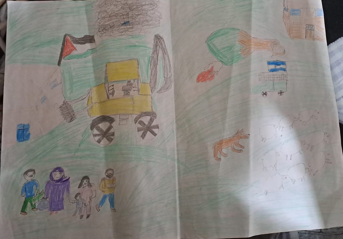 In this final drawing, a large backhoe is in the process of demolishing a home from which the Palestinian flag flies. An Arab family is gathered below the home. On the right side of the drawing, above an Israeli flag, an olive tree has been cut down and a sheep has been killed.